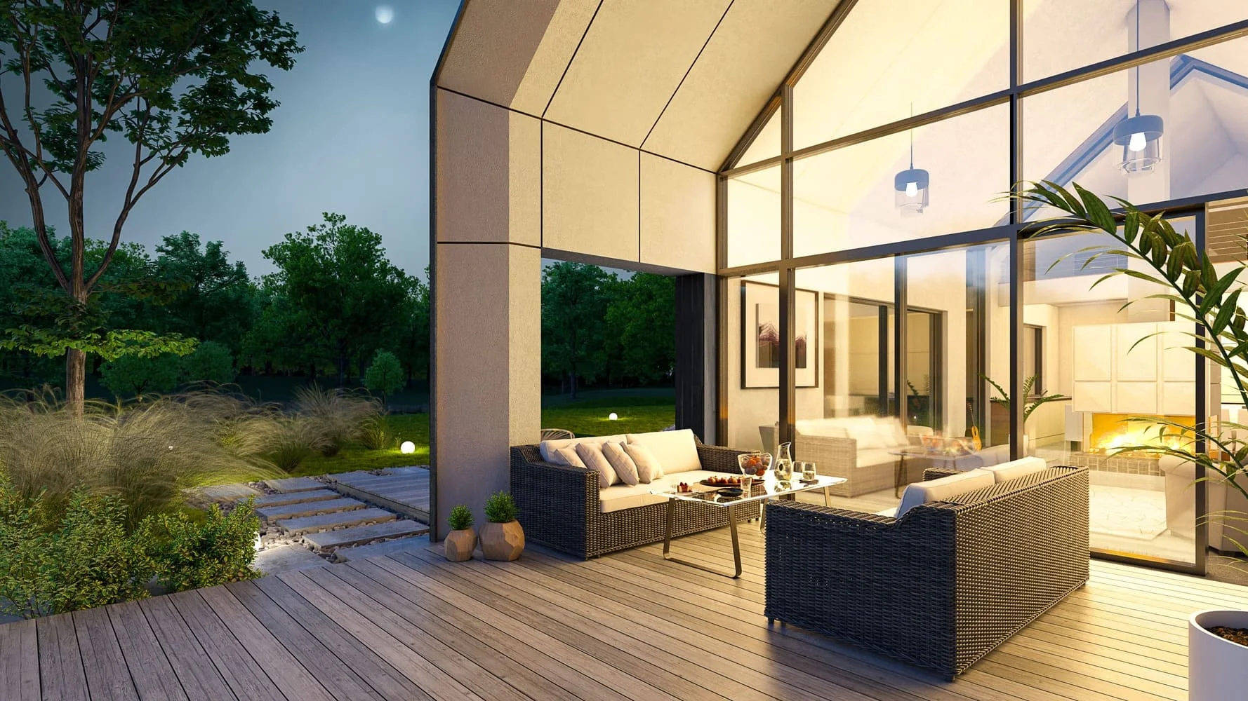 U szczytu budynku na uwagę zwraca ciekawie wkomponowany w bryłę półotwarty taras z odkrytym przedłużeniem, gdzie znalazło się miejsce np. na leżaki. Przeszklona ściana frontowa zapewnia odpowiednio dużo światła w salonie, przez co budynek ma szansę w większym stopniu wpisać się w założenia budownictwa pasywnego (wykorzystanie naturalnego potencjału słońca i stron świata). Zawsze staramy się w naszych projektach łączyć estetykę z tego typu rozwiązaniami technicznymi.