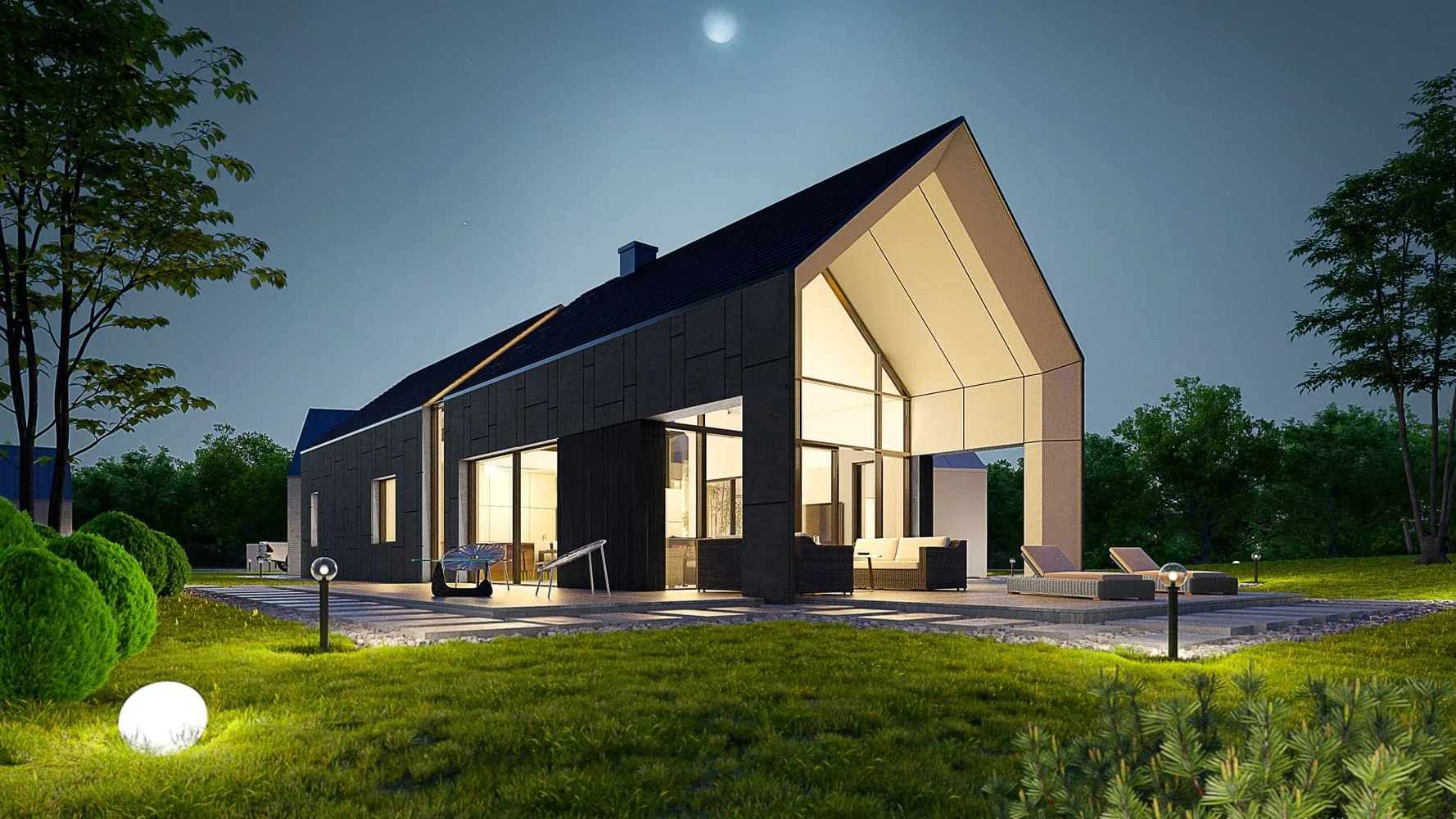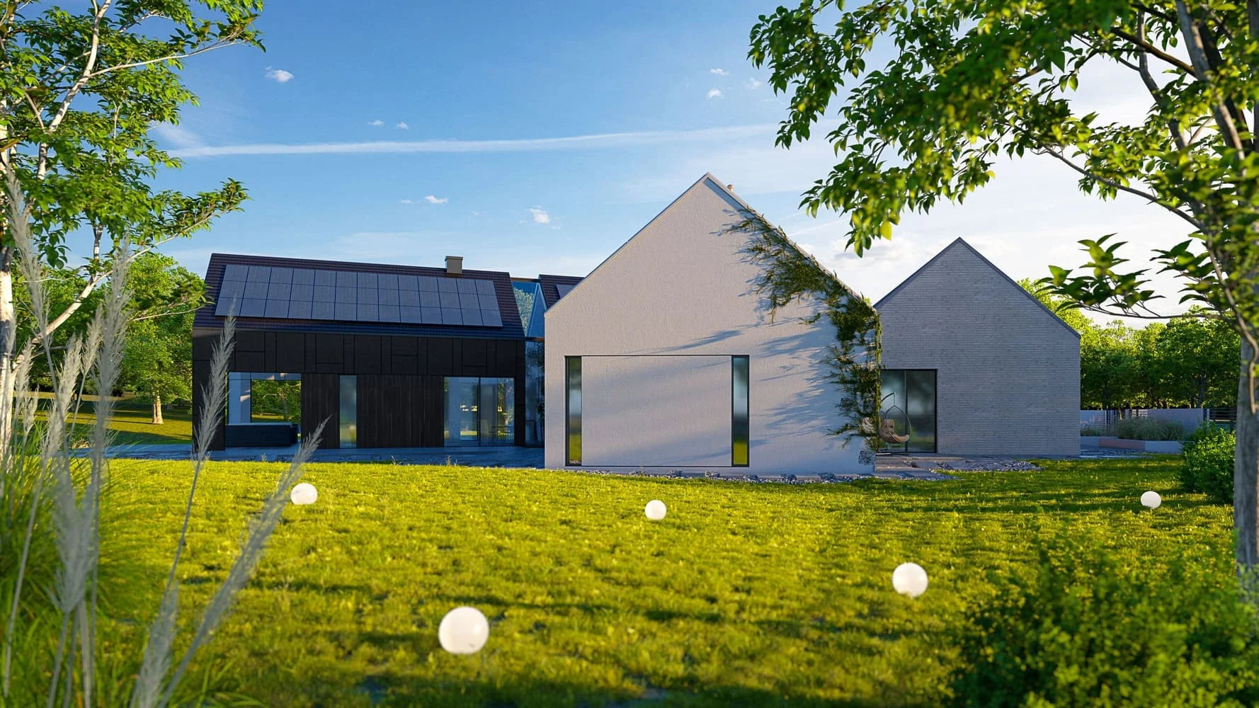 Geometryczne formy i nowoczesne materiały inspirowane są nowoczesnym stylem skandynawskim, ale dzięki prostocie ten projekt wpisuje się w charakter podmiejskiej okolicy Gdańska. Na działce zmieścił się też budynek gospodarczy w stylu spójnym z domem.