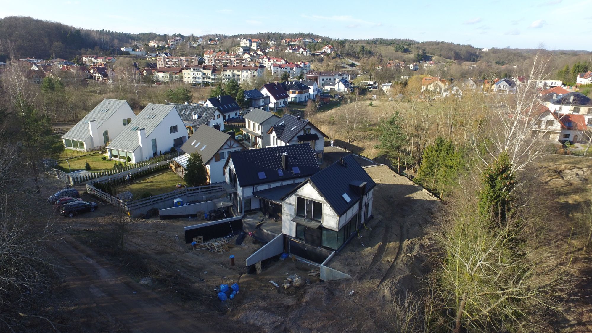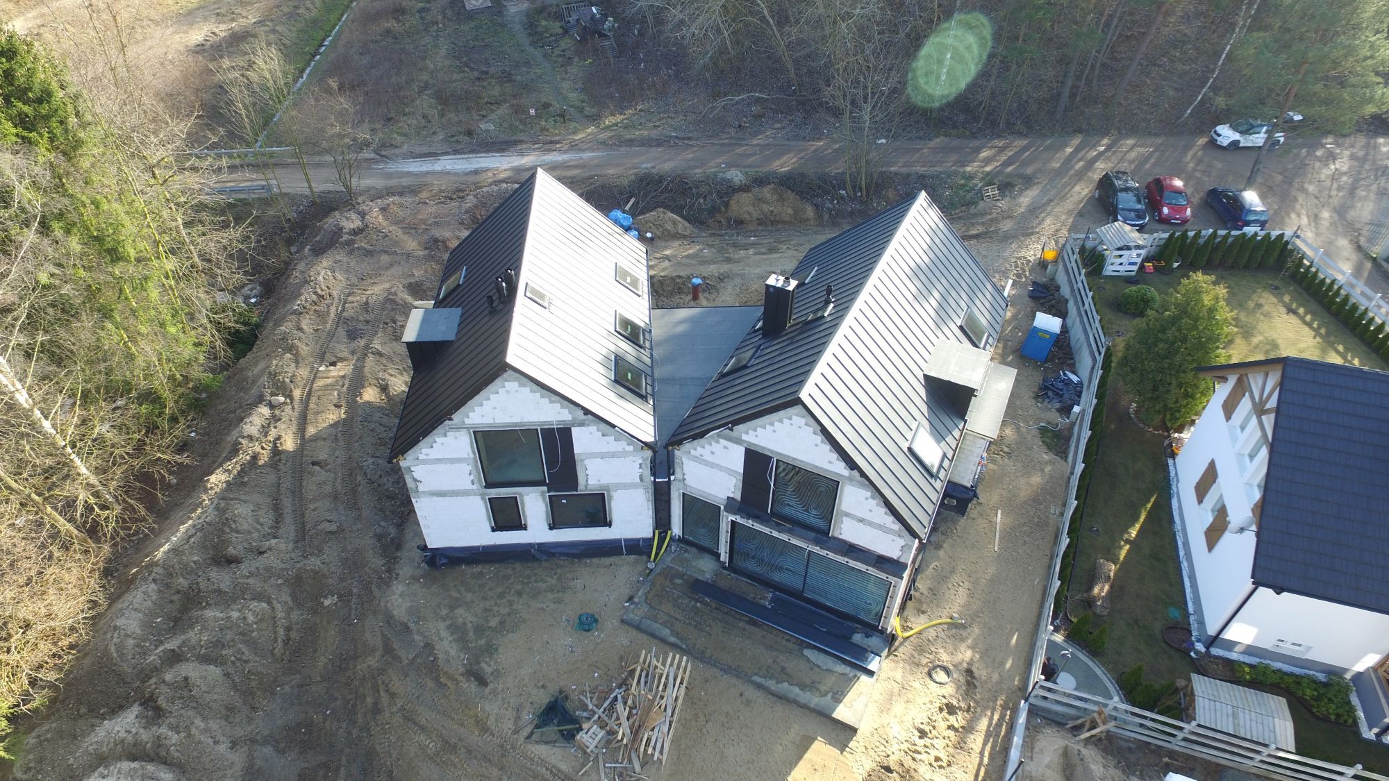 Domy nie stoją do siebie równolegle, ale tak, by maksymalnie wykorzystać potencjał zabudowy działki i dostęp do promieni słonecznych, jednocześnie obu rodzinom zapewniając należną intymność. Projekty wnętrz domów dopasowany jest oddzielnie do potrzeb mieszkańców.